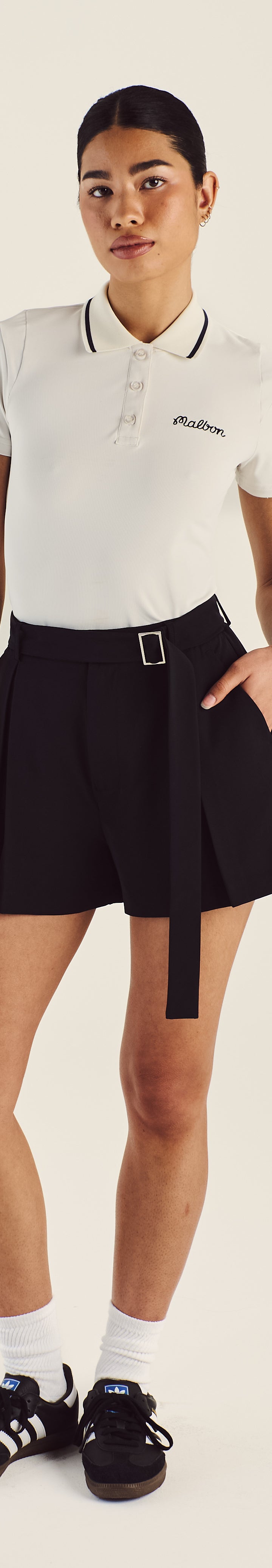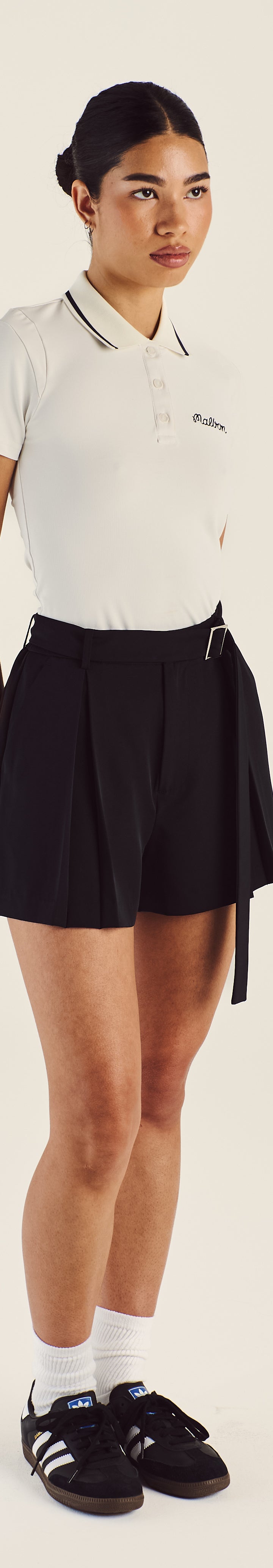 Step up your style with the Amara Pleated Shorts, designed for the modern lifestyle with sophisticated wearability. Crafted from a stretch polyester, these shorts feature a self belt with metal buckle, front pleats, and pocket storage for everyday wearability.