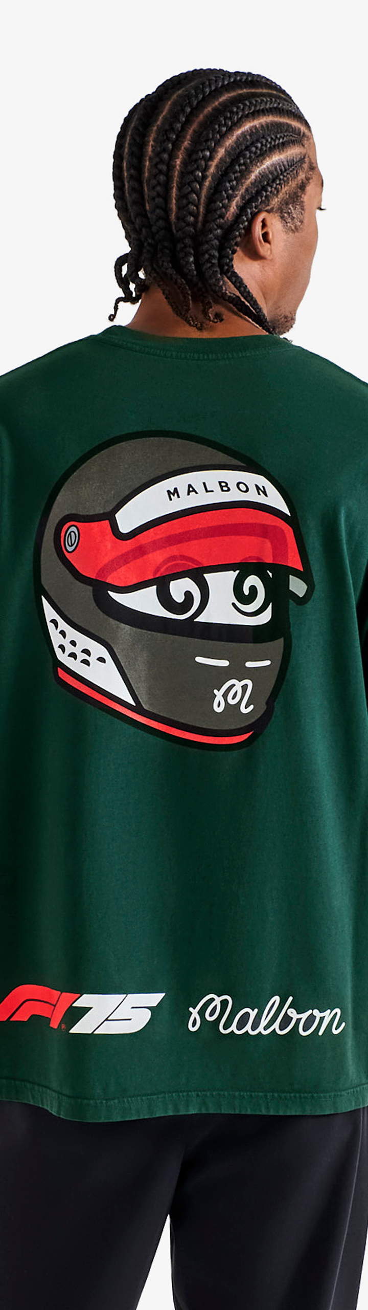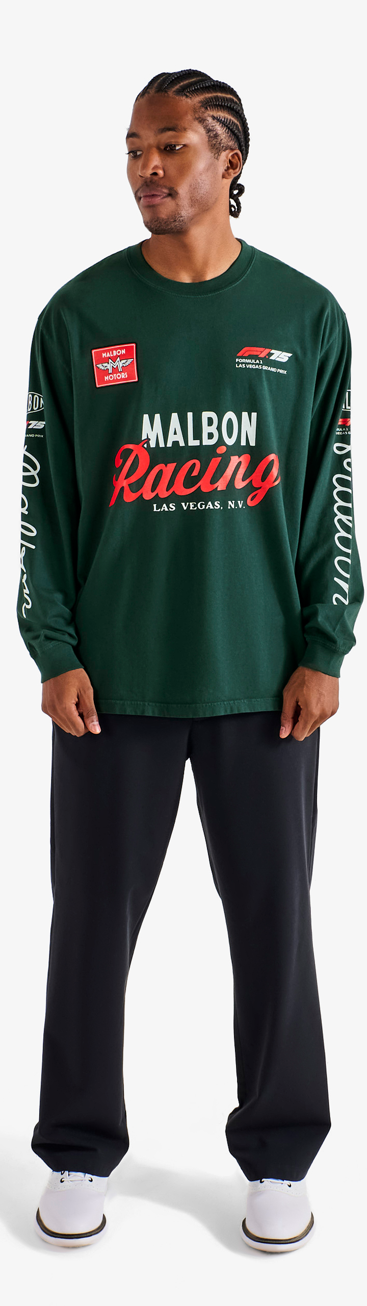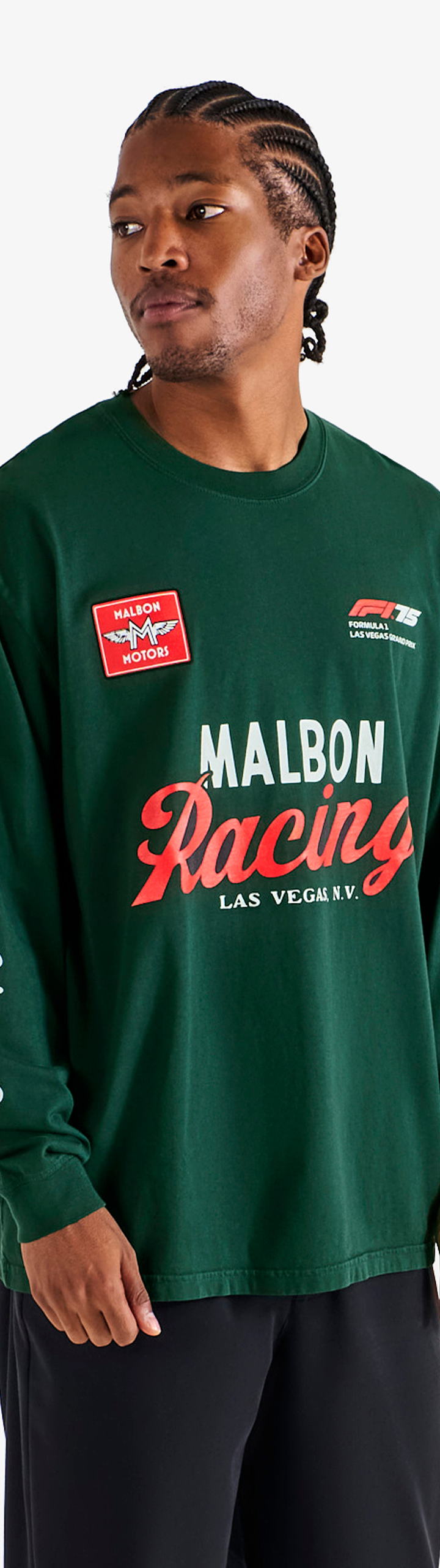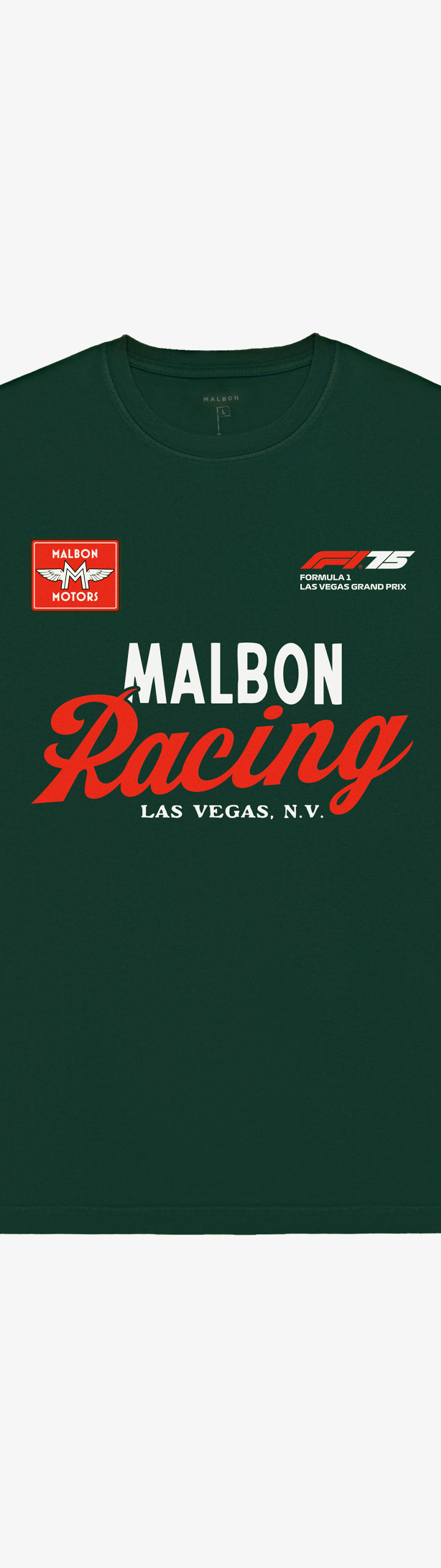- Printed Malbon and F1 Las Vegas Grand Prix branding across front and sleeves