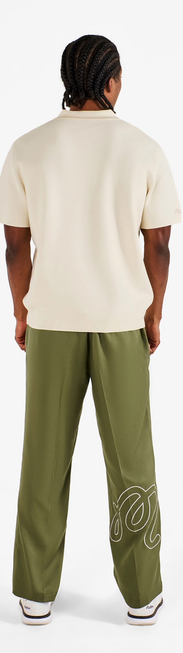 - Embroidered M script logo on right leg