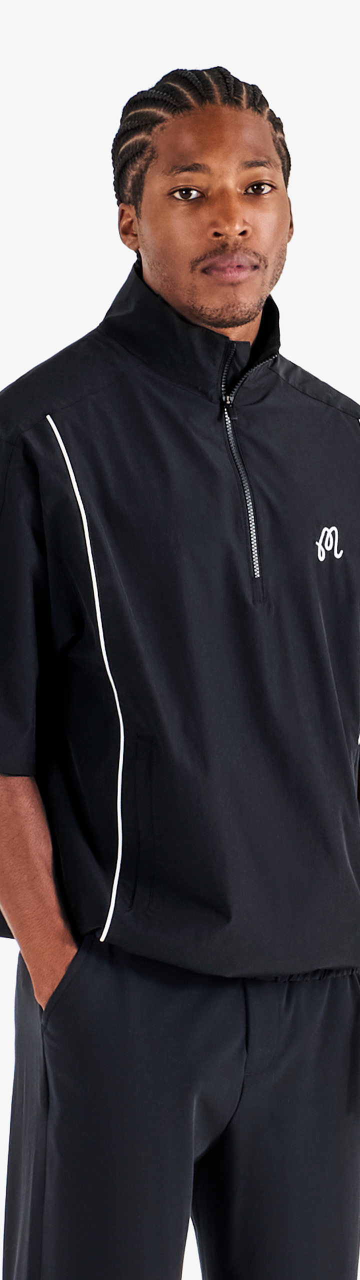 - Embroidered M script logo on left chest
