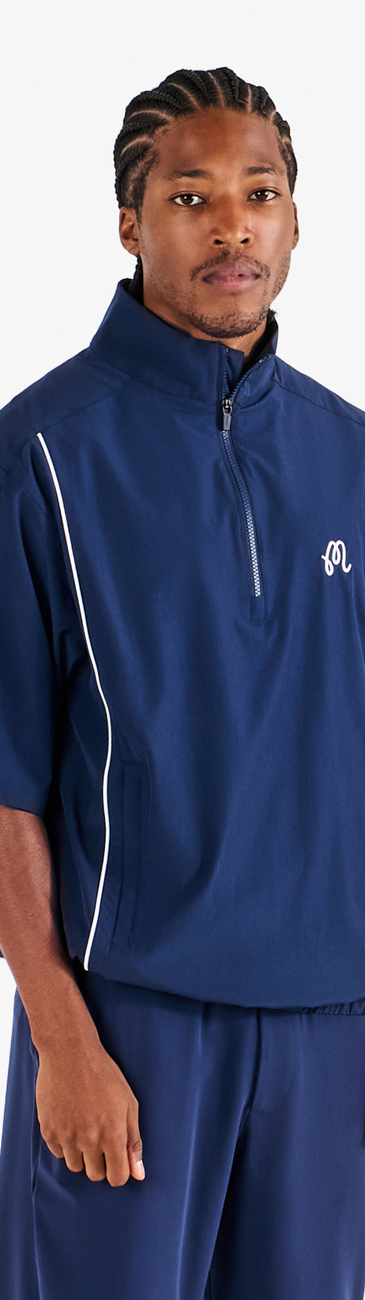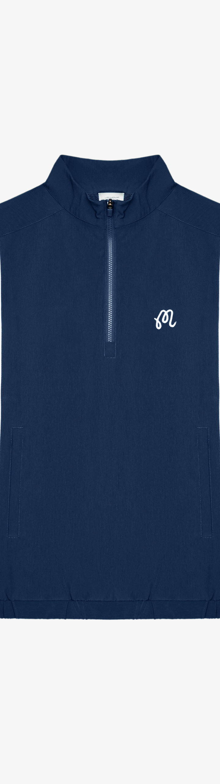 - Embroidered M script logo on left chest