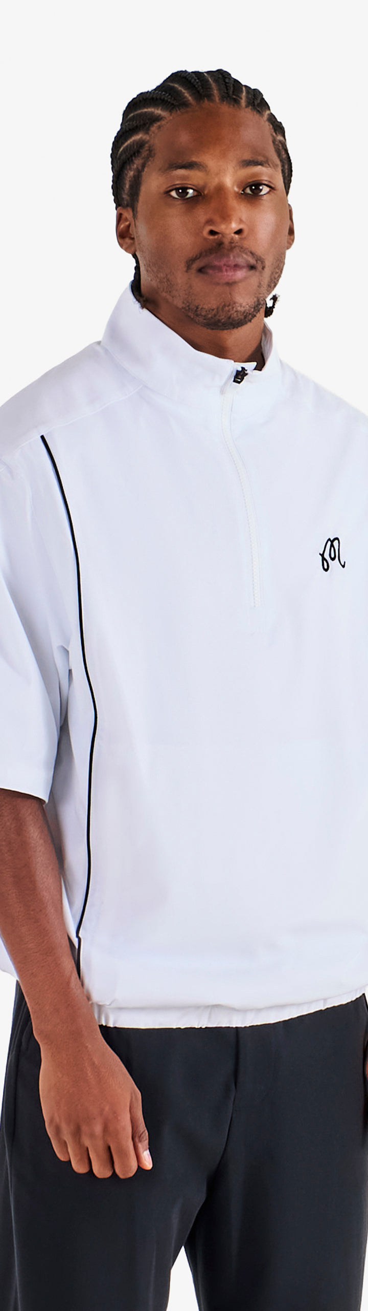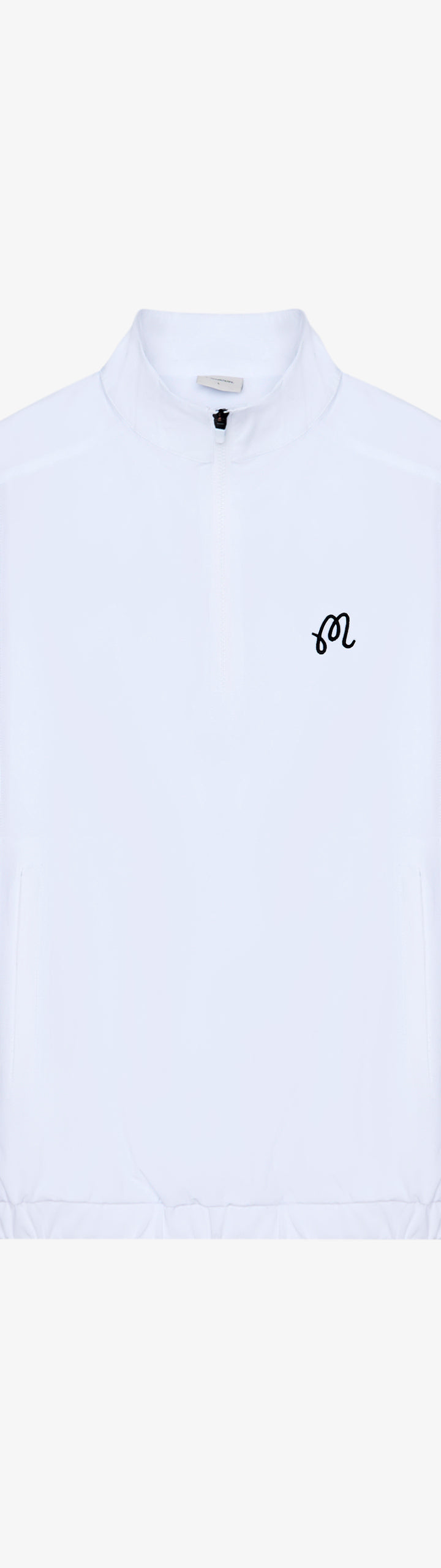 - Embroidered M script logo on left chest