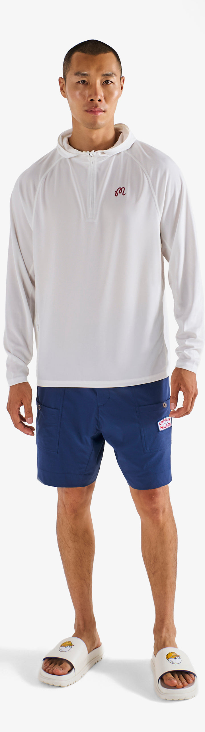 - Printed M script logo on left chest