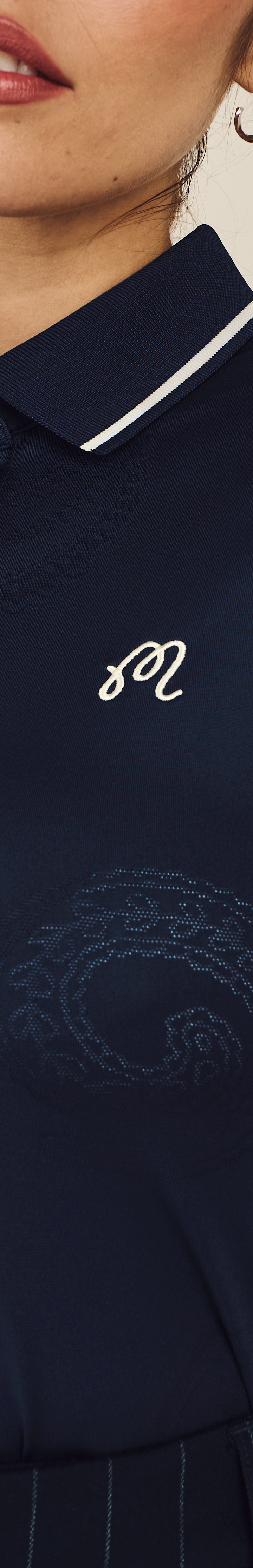 - Embroidered M script logo on left chest